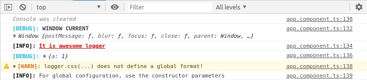 this.logger.css('color: red; text-decoration: underline; font-weight: bold').info('It is awesome logger');